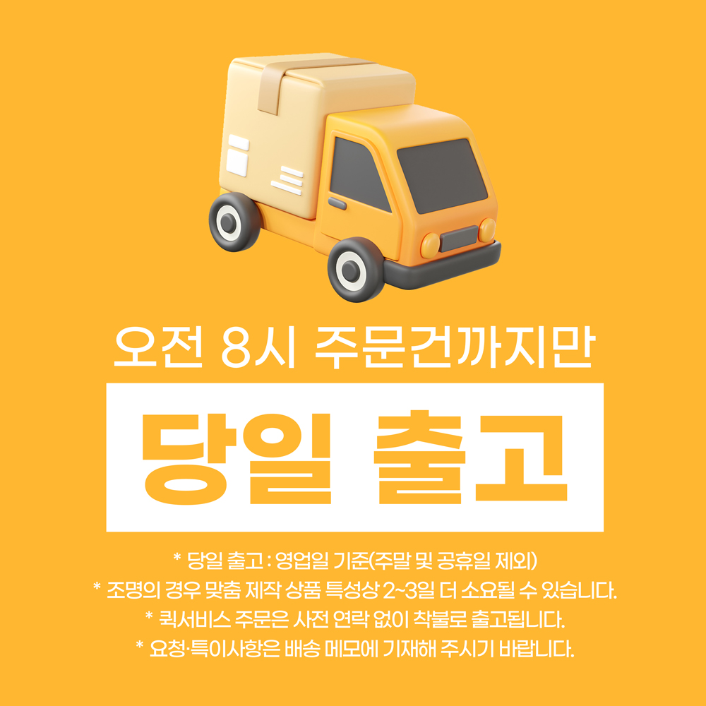 조명 상품은 주문 후 제작 상품으로, 주문일로부터 2일 이내 출고됩니다.(주말 및 공휴일 제외) 시공 일정에 차질이 없도록 여유 있게 미리 주문해 주시기 바랍니다.